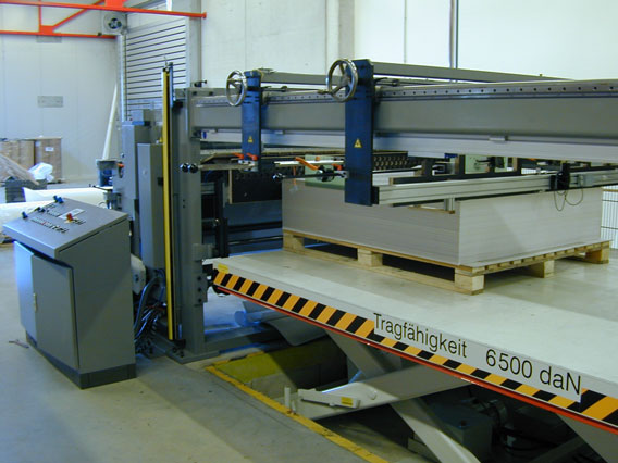 Der Hub-Querschneider ist mit einer Längsschneideinrichtung und einem Ableger ausgerüstet und somit in der Lage, eine Materialbahn (z. B. Papier) von der Rolle in Bögen zu konfektionieren und kantengerade auf eine Palette zustapeln.
