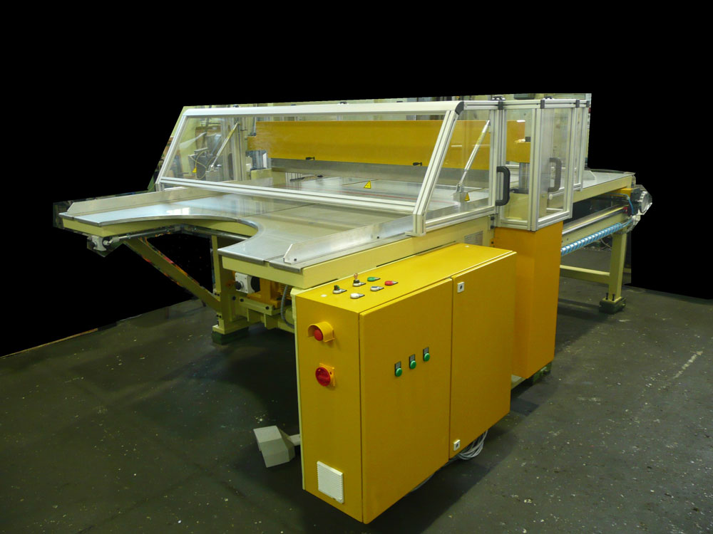 Dementsprechend bewegt sich die Querschneideinheit während des Schnittes synchron zur schneidenden Materialbahn. Die Abschnitte werden dabei von umlaufenden Transportbändern geführt.