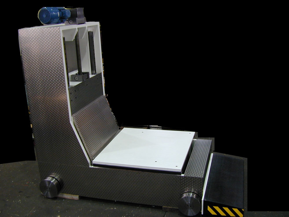 Der Transportwagen verfährt vor den beiden Dornabwicklungen und beschickt diese abwechselnd mit vollen Coils. Hierzu wird auf der Hubplattform eine Muldenpalette aufgesetzt.